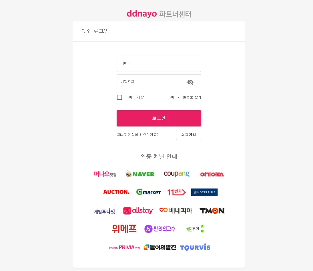 파트너센터를 이용하시려면 우선 회원가입을 하시고 로그인을 해야 접속이 되어집니다. 회원가입 후에는 숙소명, 주소, 연락처, 객실 정보, 가격정보, 사진 등을 넣어야 하구요. 검수팀의 확인 후 승인이 완료되어야 이용을 하실 수 있다고 하네요.