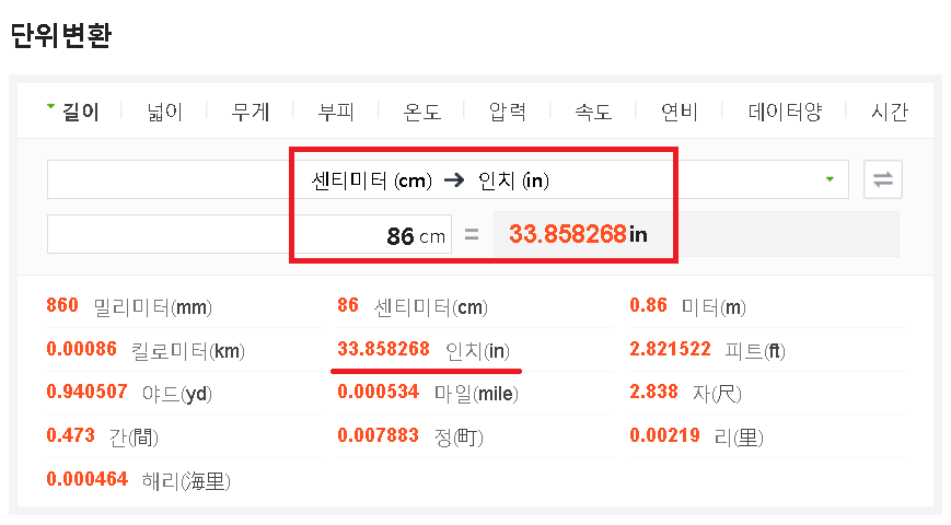 허리둘레와 같은 경우는 센치미터(cm)로 재기도 하지만 보통 바지 사이즈로써 인치로 이야기를 많이합니다. 때문에 허리사이즈를 cm로 재었을 경우 몇 인치인지를 계산해봐야 하는데요. 단위계