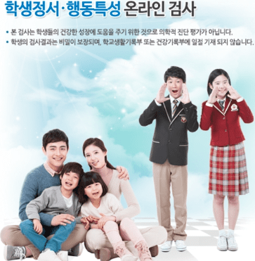 학생들의 정신건강 증진을 위하여 에듀로에서는 학생정서 행동특성발달에 대해 검사를 진행합니다. 이런 검사는 온라인으로 매년 진행이 되어지고 있습니다. 학생 학부모 참여 교육설문 대상자 분들은 인터넷으로 간편하에 검사 진행해보시기 바랍니다.