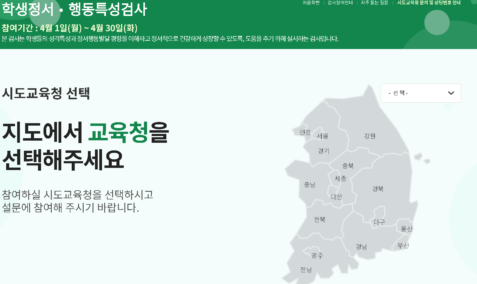 이런 교육부에서 제공하는 '학생정서 행동특성 온라인 검사'는 4월 1일부터 30일까지 진행됩니다. 검사 방법은 온라인 검사 페이지를 통해 해당 시도 교육청을 선택하고 참여자 구분을 학부모나 학생으로 택하면 됩니다.