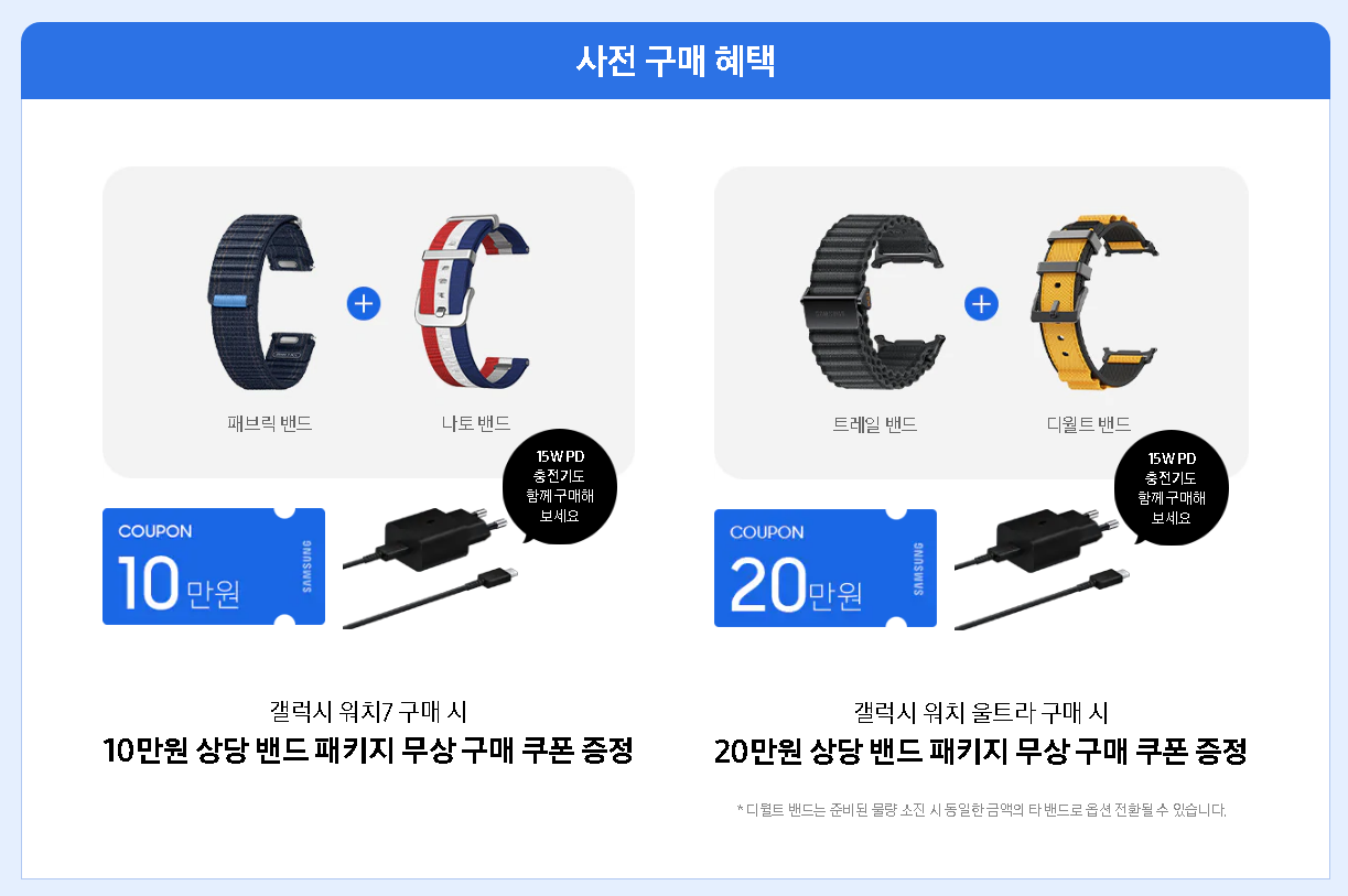 갤럭시 워치 7과 워치 울트라 사전구매혜택으로는 각각 10만원과 20만원 상당의 밴드 패키지 무상구매쿠폰이 증정됩니다.