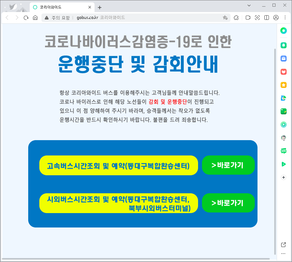 코리아와이드는 대구광역시를 연고로 하는 중견기업으로 여러 자회사를 통해 다양한 운송사업을 하고 있습니다. 현재 사이트에서는 코로나19로 인행 운행중단 및 감회안내로 나오는데요. 고속버스시간 조회 및 예약과 시외버스시간조회 및 예약은 각 통합예매와 버스타고로 이동하여 하실 수 있으니 확인하시고 이용하시면 됩니다.