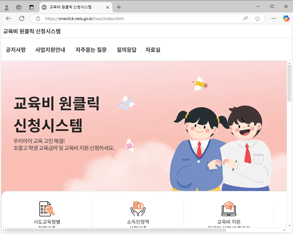 ※ 지원 조건은 가구의 소득 및 재산, 학생의 학교 유형 등에 따라 달라질 수 있으니, 자세한 내용은 반드시 교육비 원클릭 신청 시스템에서 확인하시기 바랍니다.