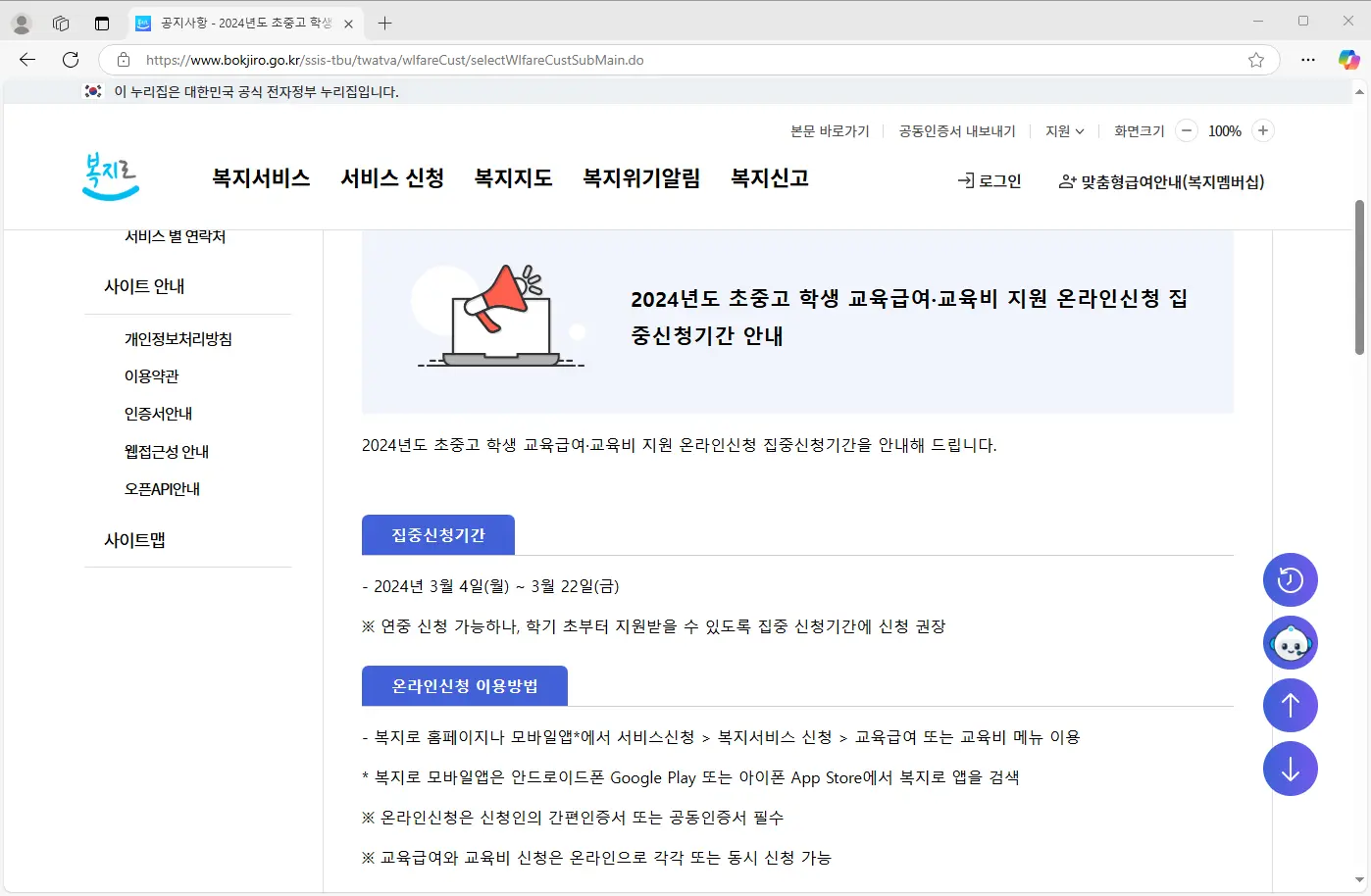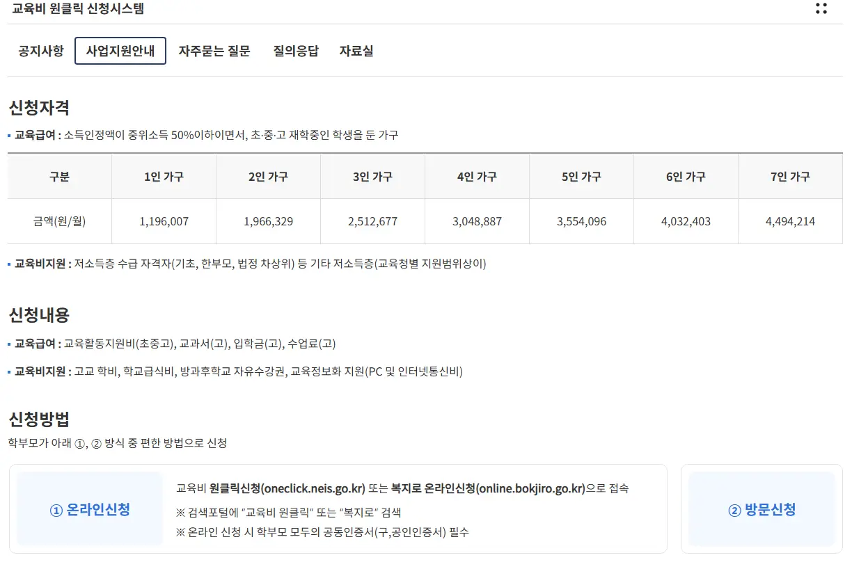 - 온라인 신청: 교육비 원클릭 신청 시스템 홈페이지 또는 복지로 웹사이트/앱 접속