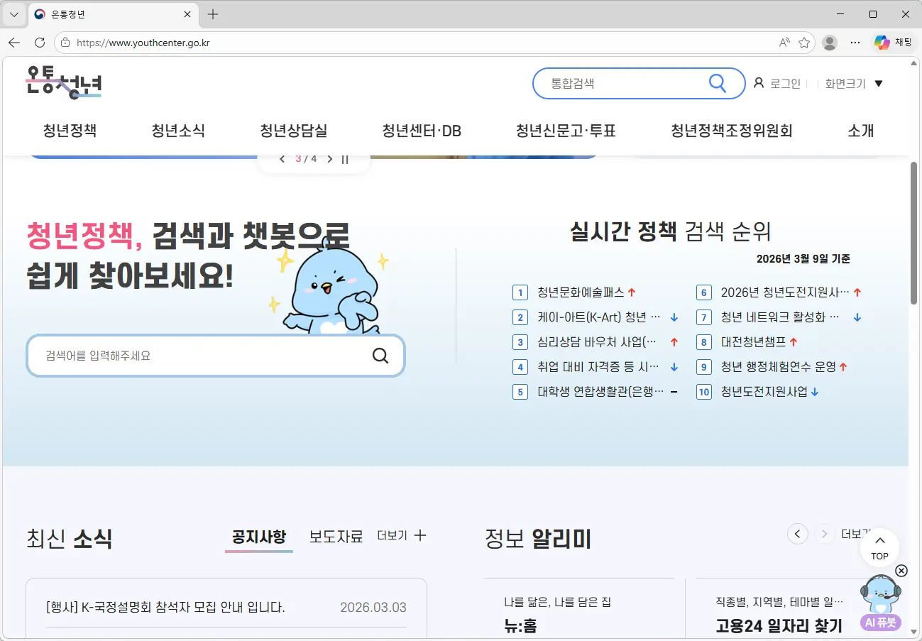 취업 준비생들에게 단비 같은 청년도약계좌, 청년취업지원금 등의 최신 소식이 가장 빠르게 업데이트되는 곳이 바로 여기입니다. 각 정책의 신청 기간과 소득 요건, 지원 금액 등을 수치 기반으로 상세히 안내하죠. 금융 공학적으로 볼 때, 청년기에 시작하는 자산 형성 프로그램은 생애 주기 소득 곡선의 안정성을 높이는 결정적인 변수가 됩니다. 공지사항의 '뉴스레터'를 구독해 두면, 예산 소진으로 조기 마감되기 일쑤인 인기 정책들의 접수 시작일을 놓치지 않고 선점할 수 있습니다.