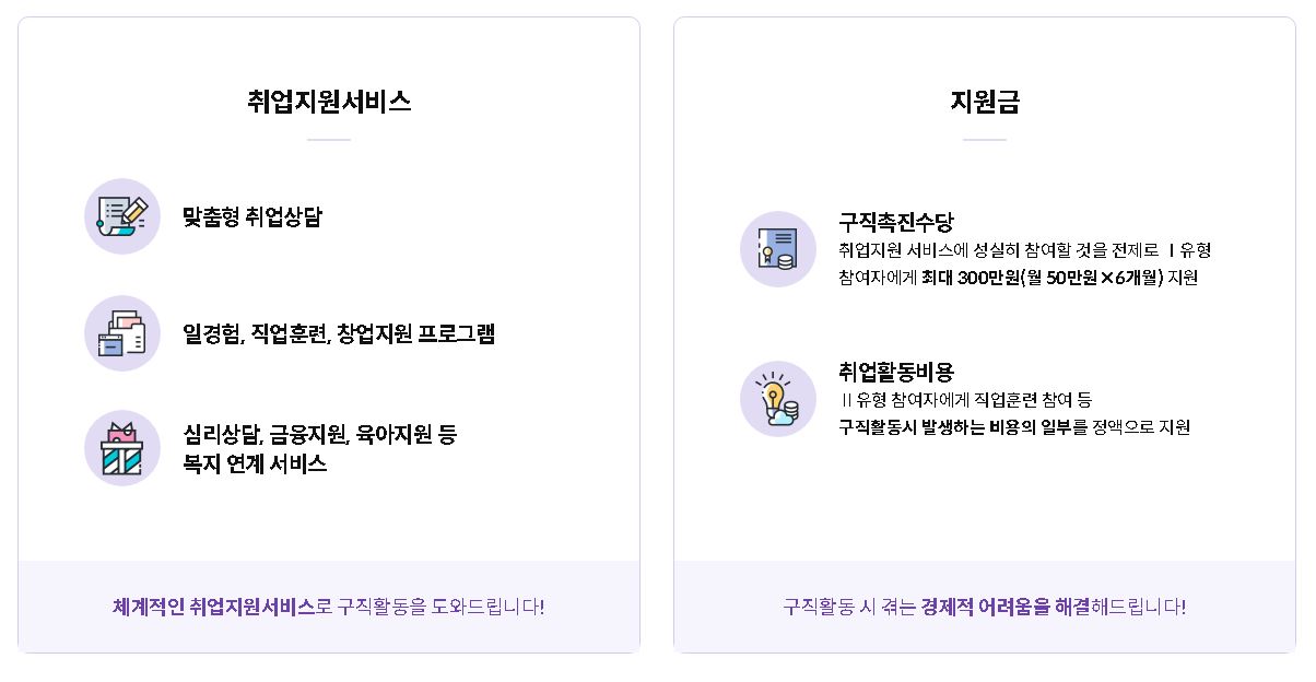 관련 홈페이지에서 취업지원서비스, 지원금 등에 대한 정보 잘 보시고 조건에 맞으시면 지원을 받으시길 바랍니다.