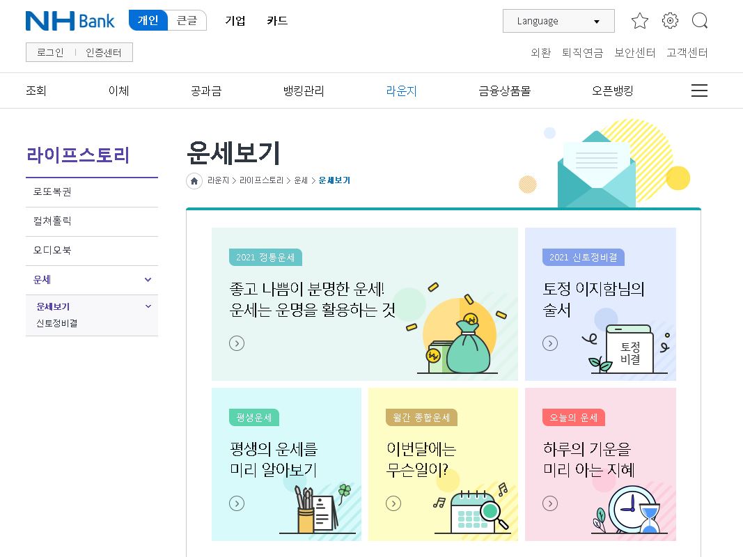 농협은행 인터넷뱅킹 무료 토정비결에서는 정통운세 및 꿈해몽, 오늘의 운세 등 다양한 운세에 대한 정보를 확인하실 수 있습니다.