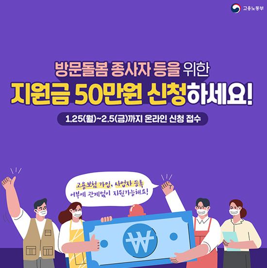 근로복지공단에서는 오늘 1월 25일부터 2월 5일까지 방문돌봄종사자나 방과후에 진행이 되어지는 학교강사를 대상으로 방문돌봄종사자 한시지원금 신청을 진행한다고 합니다. 이번 지원금은 대상자들에게 1인당 50만원을 준다고 하는데요.