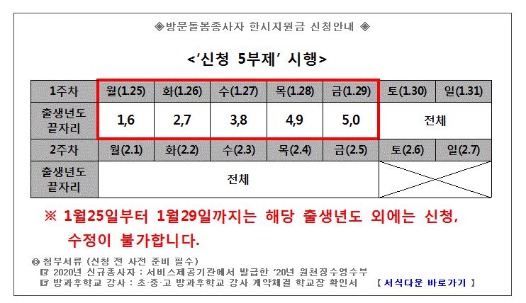1월 25일부터 29일까지는 신청이 5부제로 진행이 되어지구요. 근로복지서비스 온라인 신청 사이트를 통하여 방문돌봄종사자 한시지원금 신청이 이뤄지니 참고하시고 이용을 해보심이 어떨까 싶습니다.