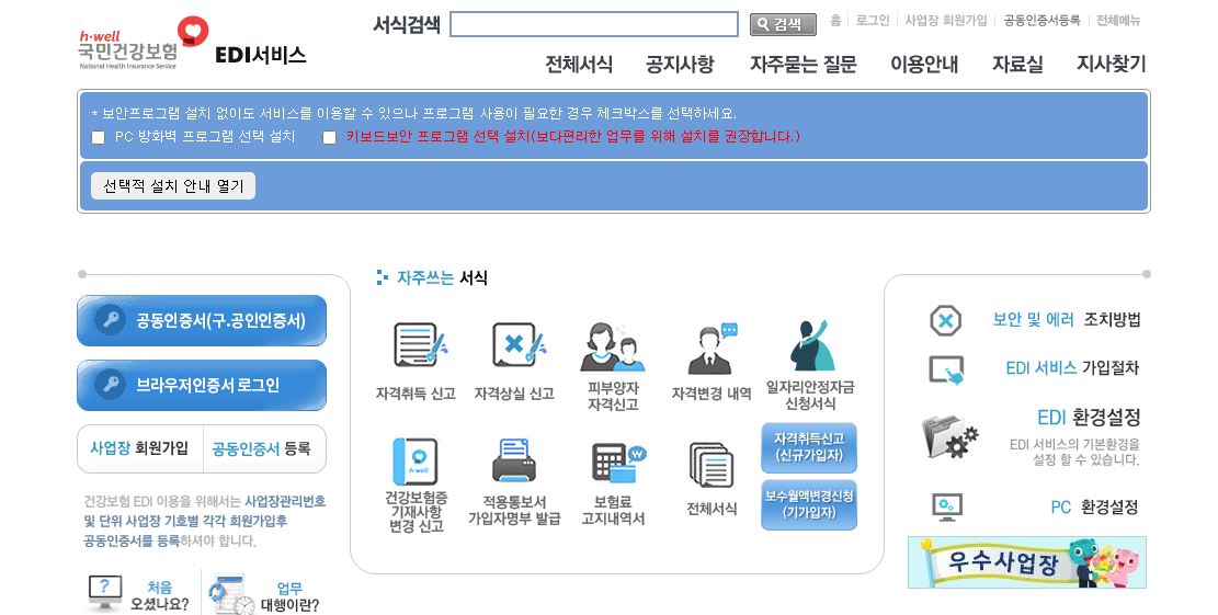 대한민국의 건강보험을 책임지고 관리를 하고 있는 국민건강보험공단에서는 국민건강보험 EDI서비스를 통하여 보험료 산정 및 부과 관련된 업무 등을 확인하고 서식을 이용 가능합니다.