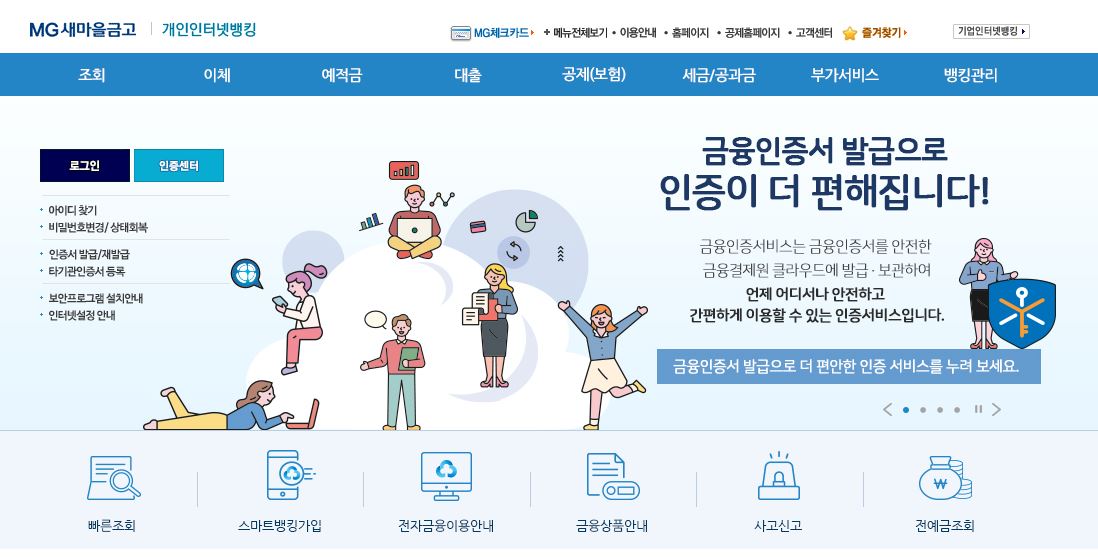 컴퓨터와 모바일에서 인터넷뱅킹은 인증서로 로그인을 하시면 이용이 가능합니다. MG새마을금고 인터넷뱅킹 홈페이지에 방문을 하시면 컴퓨터에서는 통장조회 및 입출금을 하실 수 있는데요. 그 전에 미리 공인인증센터에 방문을 하시고 인증서를 발급받아서 사용을 해보도록 하세요.