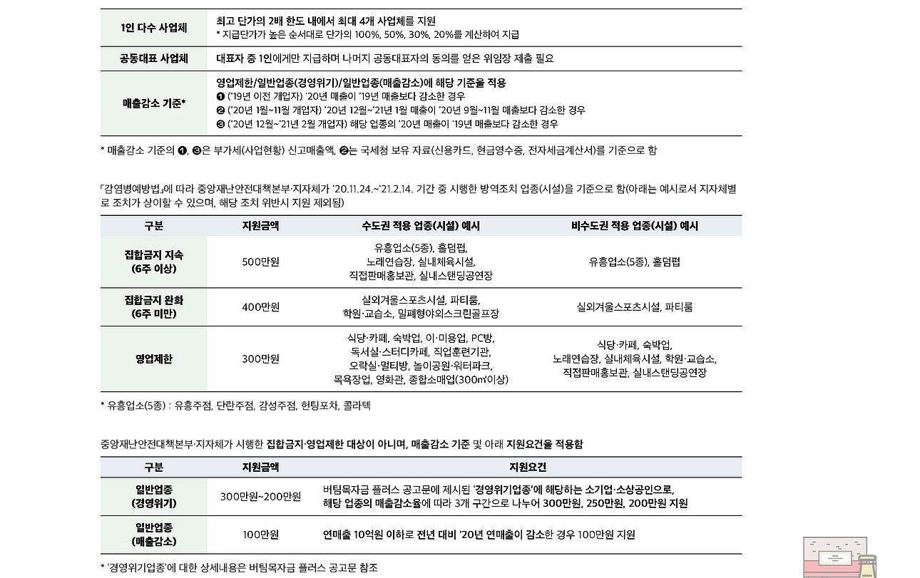 집합금지 지속 (6주 이상)의 업종에게는 최대 500만원이 지원이 되어지는데요. 자세한 내용은 버팀목자금 플러스 콜센터인 1811 - 7500을 통하여 확인이 가능할 것으로 보입니다.