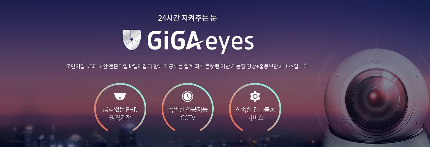 KT의 GiGAeyes 같은 경우는 KT와 보안 전문기업인 KT텔레캅이 함께 제공을 하는 지능형 영상 및 출동 보안 서비스라고 합니다. 원격으로 FHD 저장이 가능하며 신속한 출동 서비스를 지원하는데요.