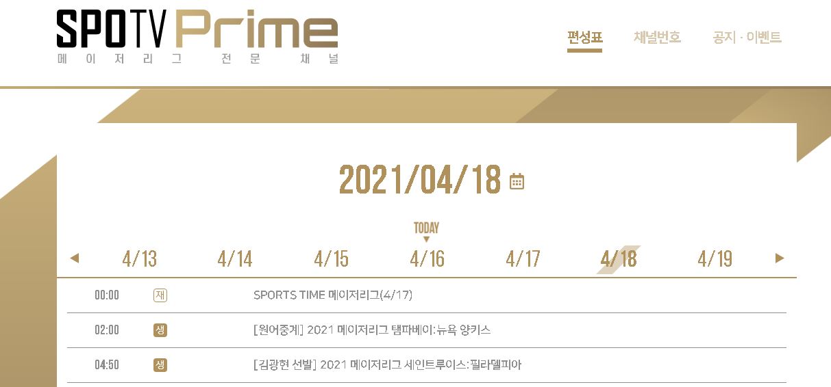 | 2021 mlb 중계방송 채널 스포티비 프라임 (https://www.spotvprime.co.kr/) (0) | 2021.04.08 |