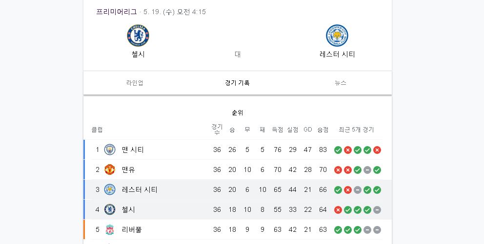 첼시와 레스터 시티 그리고 리버풀이 잉글랜드 프리미어 리그 3~4위 자리를 두고 치열한 경쟁을 하고 있습니다. 4위까지 주어지는 다음시즌 챔피언스리그 진출 자격을 두고 3팀은 남은 경기에서 최선을 다해야 할텐데요.