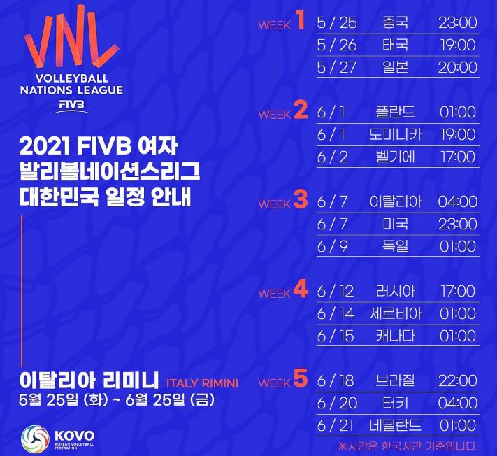 이탈리아 리미니에서 2021년 5월 25일부터 6월 25일까지 진행이 되어지는 2021 FIVB 여자 발리볼네이션스리그는 세계 정상급 여자배구 국가대표팀이 참여합니다. 대한민국 여자배구 국가대표팀 역시 이 대회에 참여하여 경기를 진행하고 있다고 합니다.