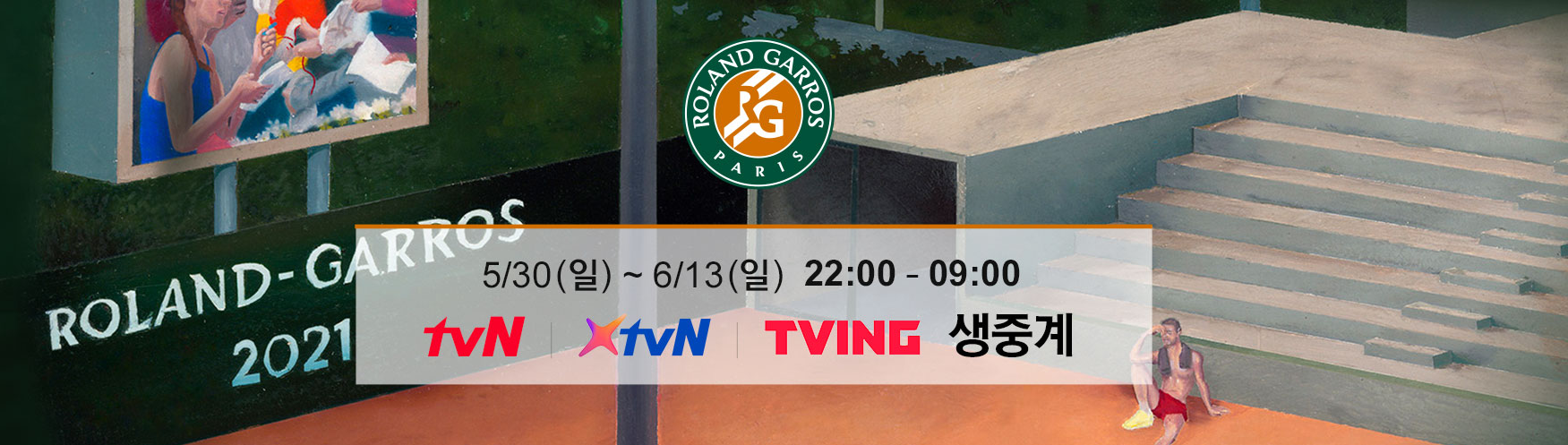 2021 롤랑가로스 프랑스오픈 테니스 대회. '테니스 4대 그랜드 슬램' 중 하나로 조코비치, 나달, 페더러 등 세계 정상급 선수들과 함께 국내 유망주 '권순우' 출전! 5/30(일) ~ 6/13(일) 22:00 ~ 09:00 tvN/Xtv