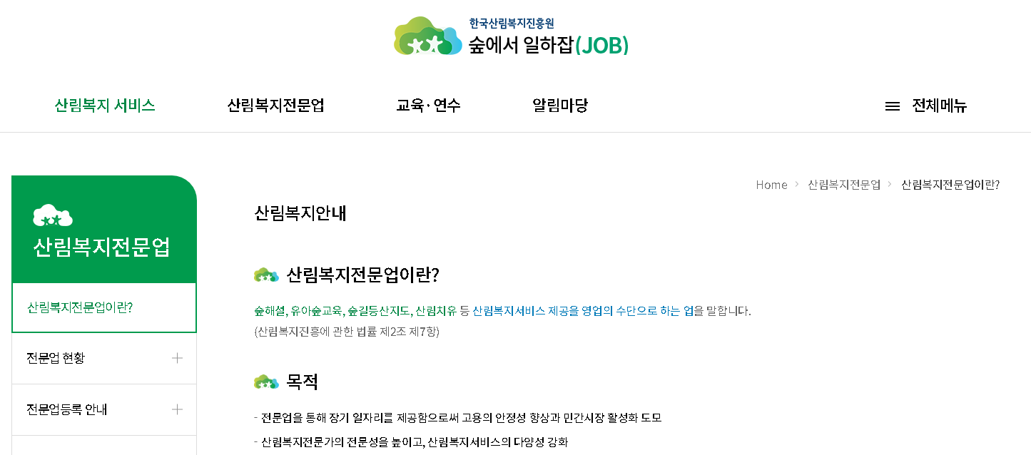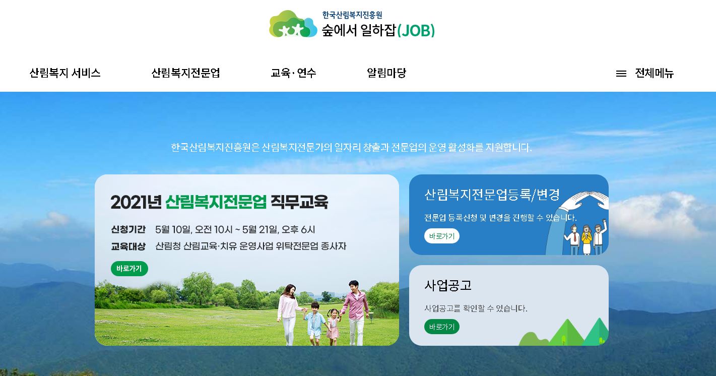 한국산림복지진흥원은 산림복지전문가의 일자리 창출과 전문업의 운영 활성화를 지원합니다. 2021년 산림복지전문업 직무교육. 신청기간: 5월 10일, 오전 10시 ~ 5월 21일, 오후 6시. 교육대상: 산림