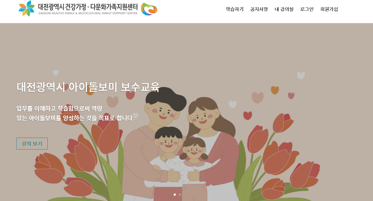 대전건강가정지원센터인 대전광역시 건강가전 다문화가족지원센터에서는 온라인 사이버교육으로 대전광역시 아이돌보니 보수교육을 진행하고 있습니다. 아이돌봄서비스에 대한 업무를 이해하고 학습하는 과정이라고 하는데요.