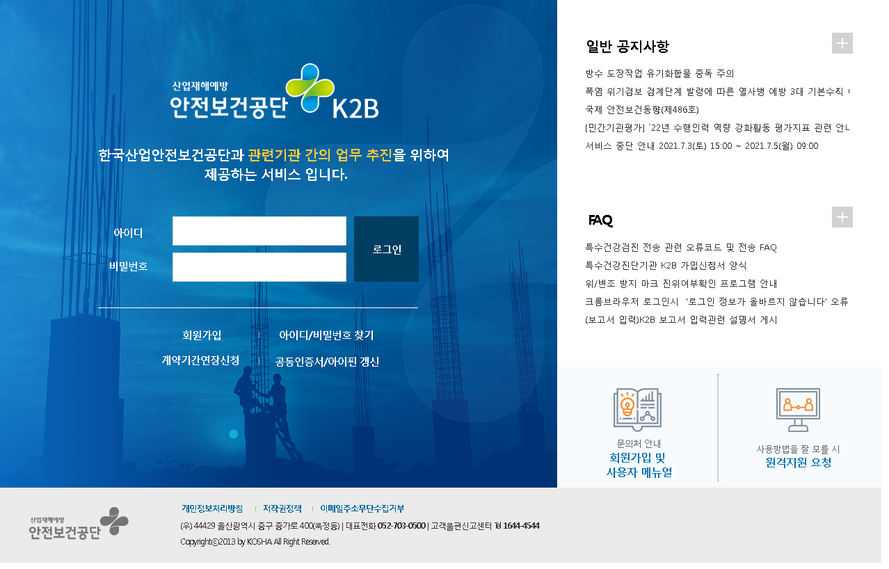 관련 업무를 진행할 수 있는 한국산업안전보건공단 온라인 홈페이지는 K2B 로그인을 통하여 접속이 가능하며, 사용방법을 잘 모를 시에는 원격 지원 요청이 가능하다고 합니다.