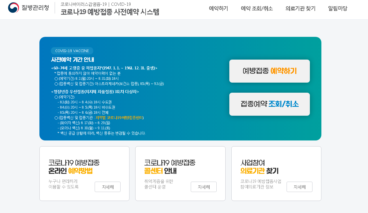 대상자가 많기 때문에 10부제로 사전예약이 실시가 되어지며, 사전예약 기간은 8월 9일부터 진행이 된다고 합니다. 예약방법은 기존과 동일하게 코로나19 예방접종 사전예약 누리집 홈페이지 ncvr.kdca.go.kr에서 진행됩니다.