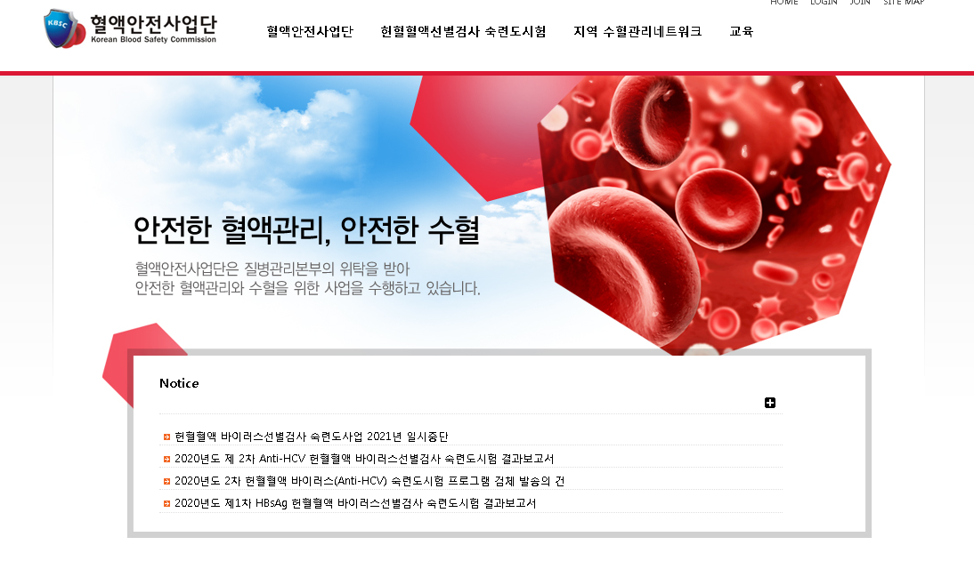 안전한 혈액관리와 안전한 수혈을 지원하는 혈액안전사업단은 질병관리본부의 위탁을 받아 다양한 사업을 수행하고 있습니다. 헌혈혈액 바이러스선별검사 숙련도사업, 헌혈혈액선별검사 숙련도시험, 지역 수혈관리네트워크 등의 내용을 혈액안전사업단 교육 홈페이지를 통하여 확인해보시기 바랍니다.