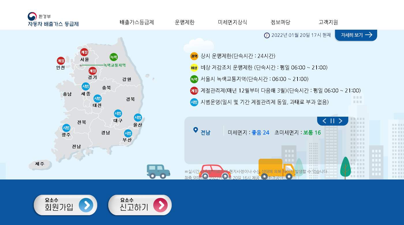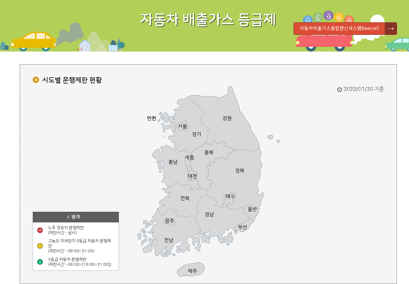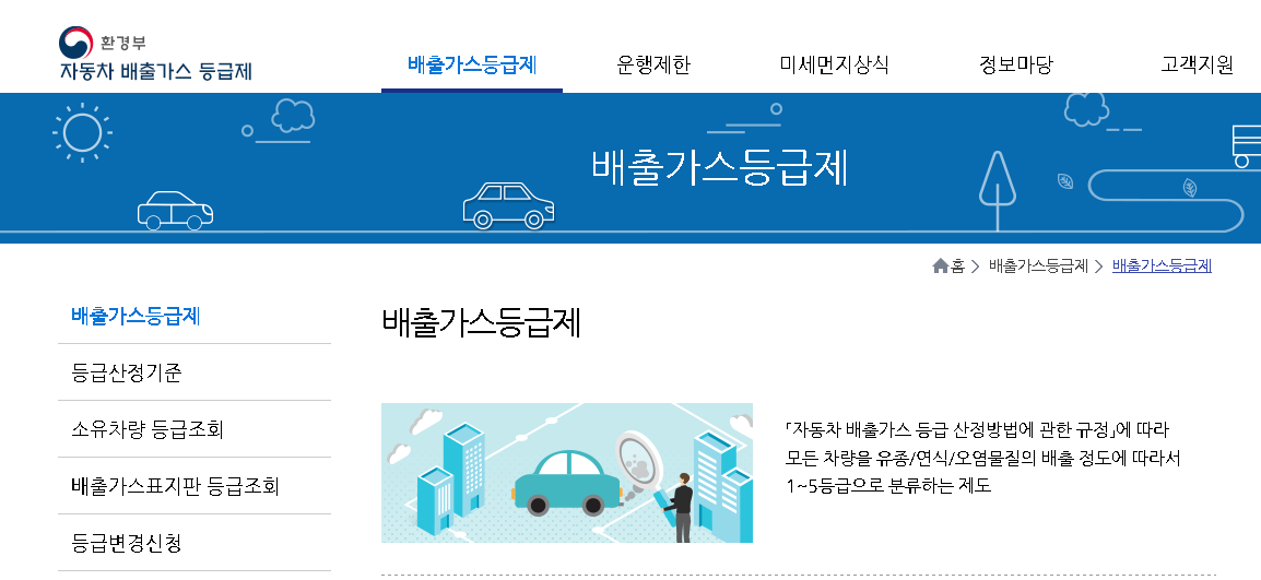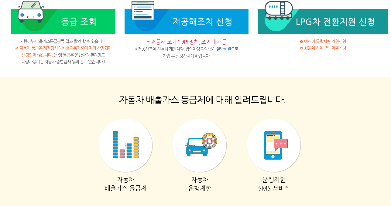 이러한 등급에 따라서 자동차 운행제한이나 저공해조치 신청이 가능하다고 합니다. 때문에 자동차 배출가스 등급제 홈페이지 잘 활용하시고 이용해보시기 바랍니다.