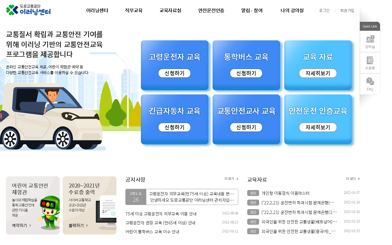 교통질서의 확립과 교통안전 기여를 위한 이러닝 기반의 교통안전교육 프로그램을 제공하는 도로교통공단 이러닝센터인데요. 고령운전자, 통학버스, 긴급자동차, 교통안전교사, 안전운전 인증 교육 등의 학습과정 확닝사시고 이수해보시기 바랍니다.