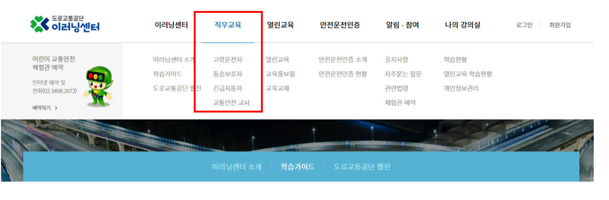 도로교통공단 온라인 교통안전교육 플랫폼을 제공하는 도로교통공단 이러닝센터 홈페이지입니다. 교통안전, 동승보호자, 인솔교사, 어린이, 통학버스 관련된 교육 확인하고 이수해보시기 바랍니다.