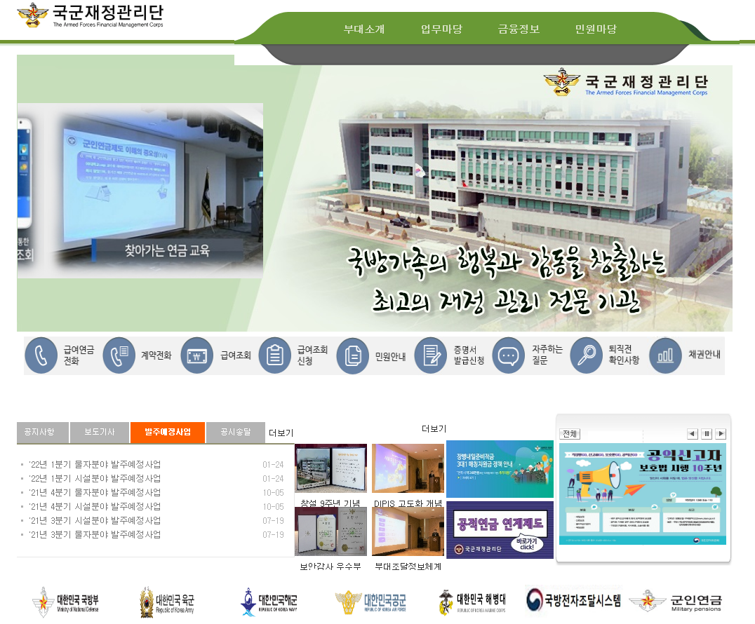 온라인으로 발주예정사업, 급여연금에 대한 확인이 필요하시다면 국군재정관리단 홈페이지 바로가기를 이용하시면 좋을 것 같습니다.