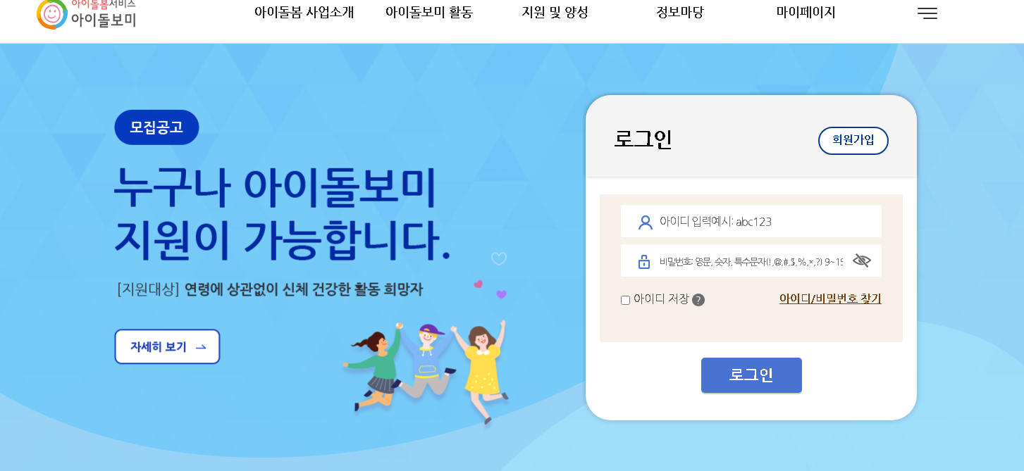 아이돌보미 활동 및 사업소개를 비롯하여 선발 및 모집공고 등을 확일 할 수 있는 아이돌봄서비스 홈페이지입니다. 아이돌보미 모집공고 및 모의계산기를 비롯하여 다양한 아이돌봄관련 내용 확인해보시기 바랍니다.
