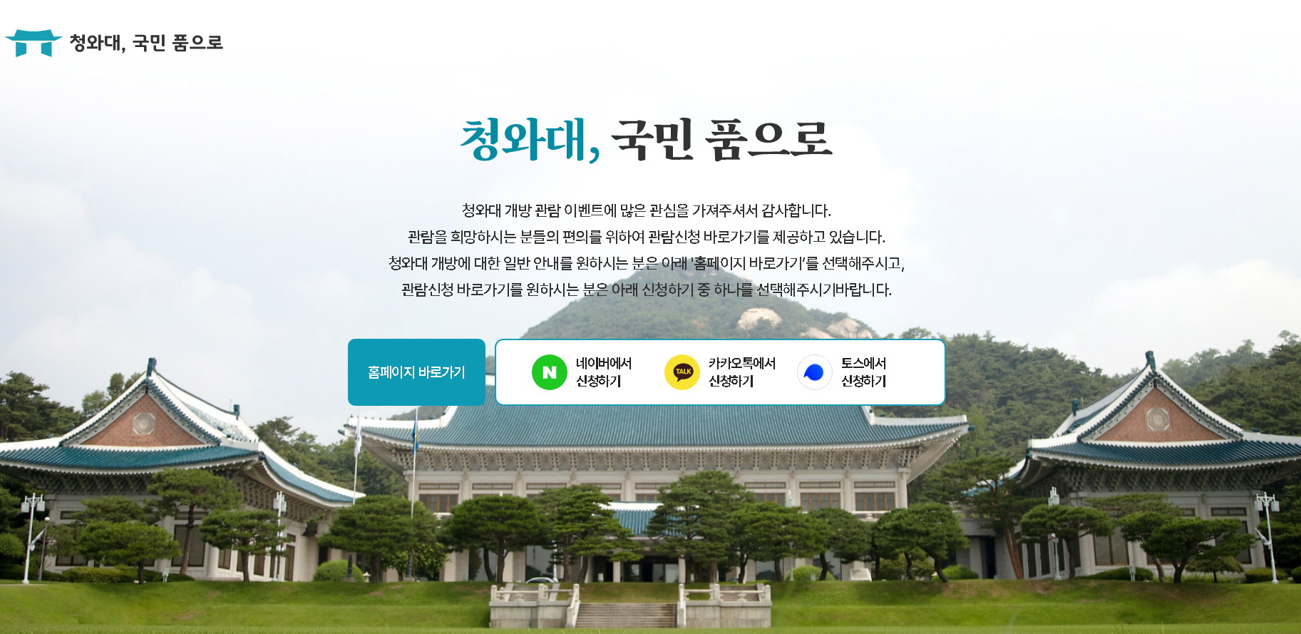 청와대 개방 예약은 청와대, 국민 품으로 홈페이지를 통하여 확인을 하실 수 있고, 네이버/카카오톡/토스를 통하여 관람신청 바로가기를 진행하실 수 있습니다.