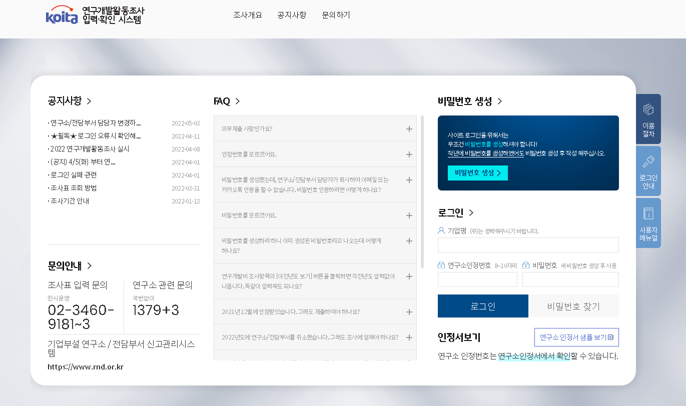 koita 연구개발활동조사 입력/확인 시스템은 연구개발활동(연구개발비 및 연구개발 인력 등) 현황을 조사하고 이를 통한 국가연구개발정책수립 기초자료를 제공합니다.
