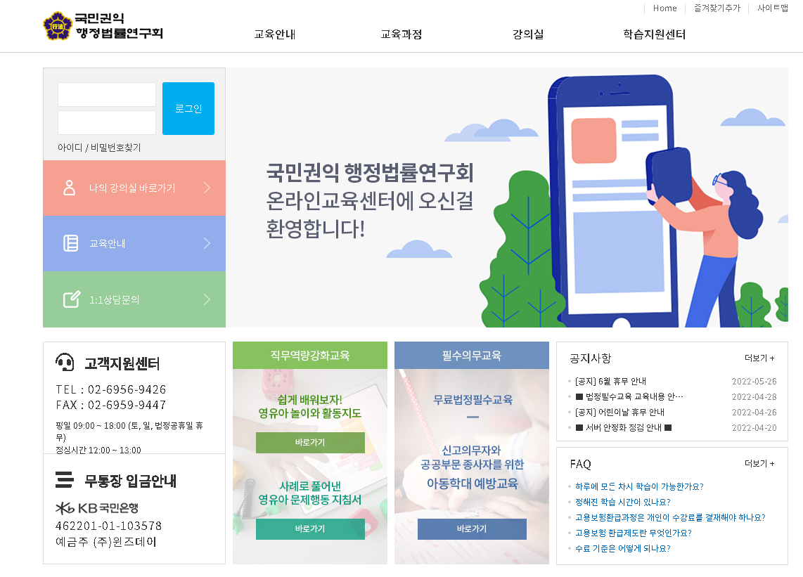 사업주 직업능력훈련, 직무역량강화교육, 필수의무교육, 아동학대 예방교육 등을 국민권익 행정법률연구회의 온라인 사이버교육센터를 통하여 확인하시고 이수 가능합니다.
