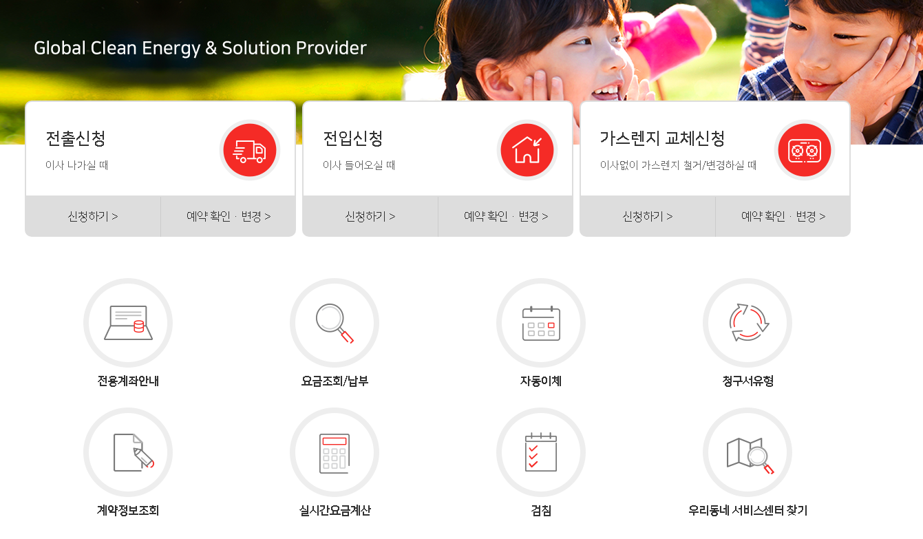 온라인 홈페이지에서는 요금조회 및 신청, 전출신청, 전입신청, 가스렌지 교체 신청, 자동이체, 요금계산, 우리동네 서비스센터 찾기 등을 진행하실 수 있습니다.