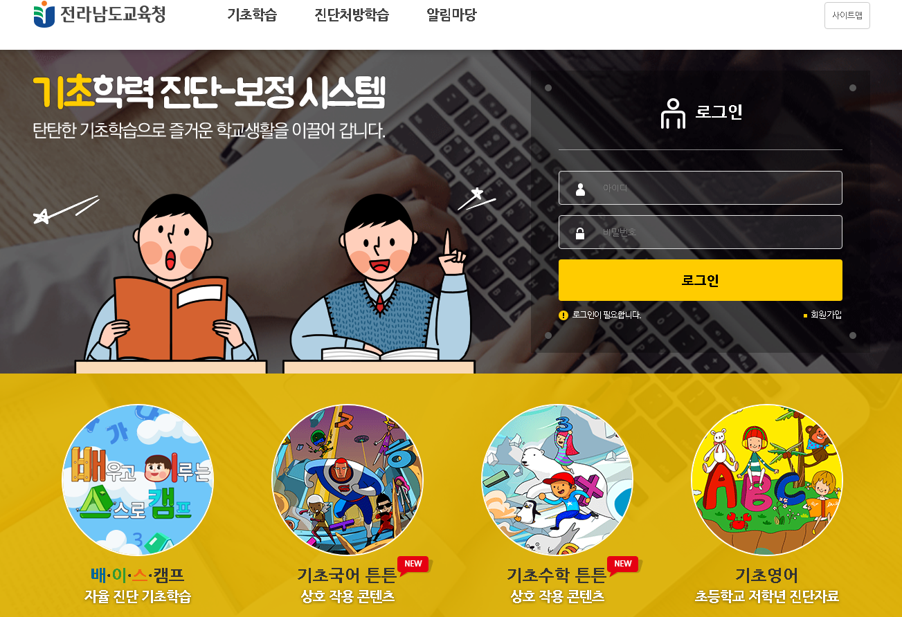 전라남도교육청에서 제공하는 전남 교육청 기초학력 진단 보정시스템 홈페이지입니다. 탄탄한 기초학습 지원을 통하여 진도 놓치지 마시고 따라가는데 도움 받으시길 바랍니다.