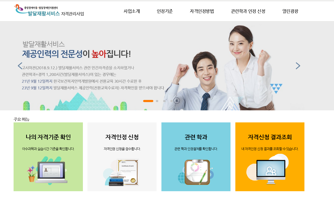 해당 사업에서는 발달재활서비스 영역별 이수해야 하는 교과목을 규정하고 자격을 인정받고도 절차를 제공합니다.