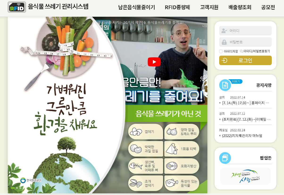 RFID태그 인식 기반으로 음식물쓰레기를 배출하면 배출량 만큼만 수수료를 지불하게 RFID음식물쓰레기 관리시스템이 구축되어져 있습니다.