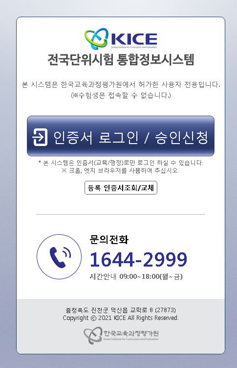 본 시스템은 한국교육과정평가원에서 허가한 사용자 전용입니다. (※수험생은 접속할 수 없습니다.) * 본 시스템은 인증서(교육/행정)로만 로그인 하실 수 있습니다. ※ 크롬, 엣지 브라우저를