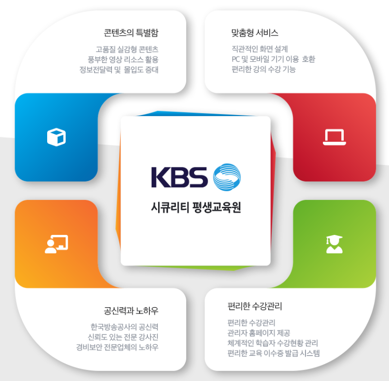 방송시설에 대한 시설보안 및 경비 업무를 담당하고 있는 KBS 시큐리티에서는 평생교육원을 통하여 법정의무, 경비원 실무 등의 교육 과정을 이수할 수 있도록 서비스되어집니다. 교육과정 확인 및 국비, 원격 학습 지원 등에 대해 확인해보시기 바랍니다.
