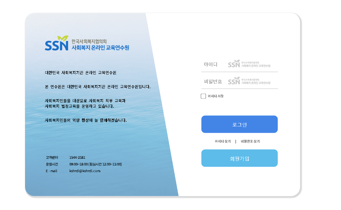 SSN 한국사회복지협의회에서는 사회복지기관 온라인 교육연수원을 운영하고 있습니다. 사회복지인들을 대상으로 사회복지 직무 교육과 더불어 사회복지 법정교육을 운영하고 있습니다.