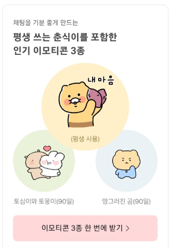 카카오가 서비스 장애에 대한 피해 보상을 진행하고 있습니다. 그런가운데 일반 이용자를 대상으로 카카오톡 이모티콘 3종 보상이 현재 진행되어지는데요. '마음 패키지'로써 춘식이는 프렌즈2가 영구 지급되어지고 토심이는 토뭉이랑 놀거야와 아기 망그러진 곰은 90일간 대여된다고 합니다.