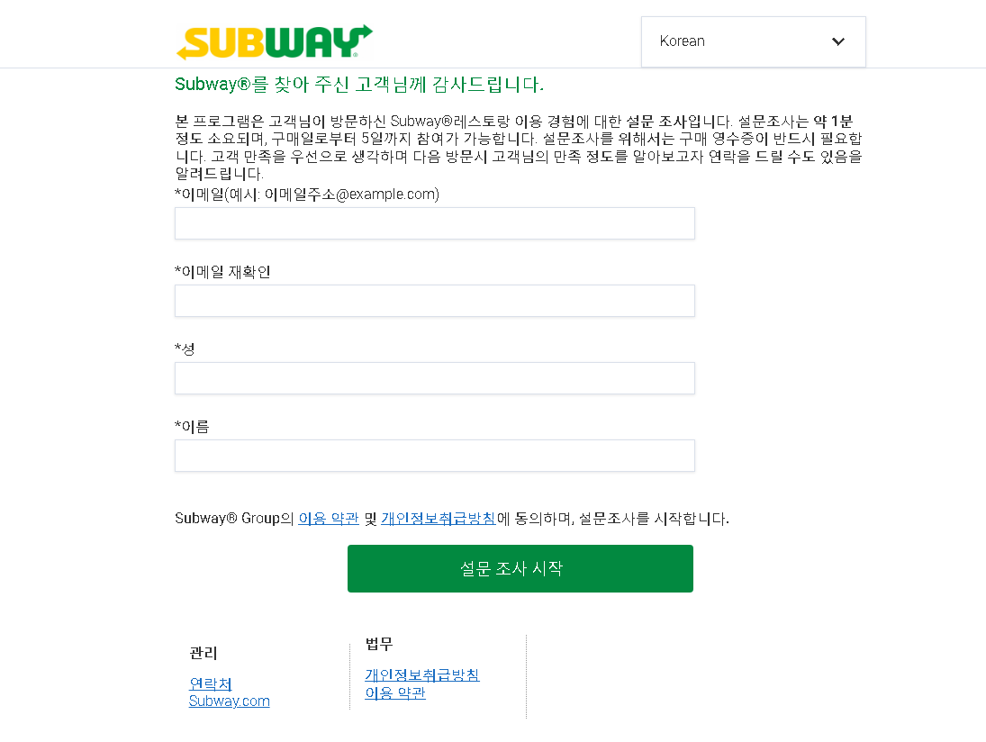 써브웨이 설문조사 Survey (www.global.subway.com)