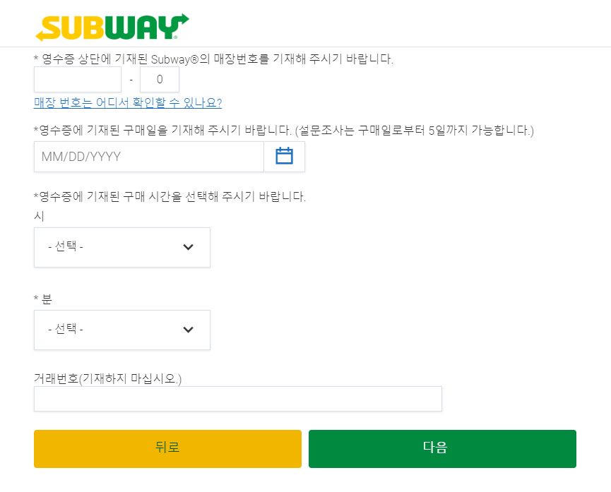 Survey에는 영수증 상단에 기재된 Subway 매잘번호, 영수증에 기재된 구매일, 구매시간 정보가 포함이 됩니다.