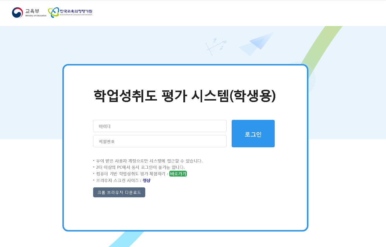 교육부와 한국교육과정평가원의 학생들을 대상으로 둔 컴퓨터기반 국가수준학업성취도 평가가 평가시스템을 통하여 진행이 되어집니다. 온라인 e-성취도평가를 통하여 시스템 이용 잘 하시길 바랍니다.