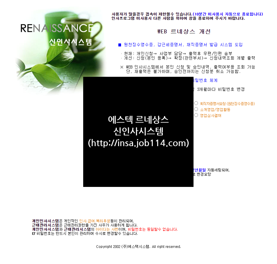 에스텍은 보안회사로써 물리보안 사업과 더불어 정보보안 사업 역량 강화를 진행하고 있습니다. 이런 에스텍의 인사관리 시스템인 르네상스는 기업 내의 다양한 근무형태를 지원하고 있다고 합니다.