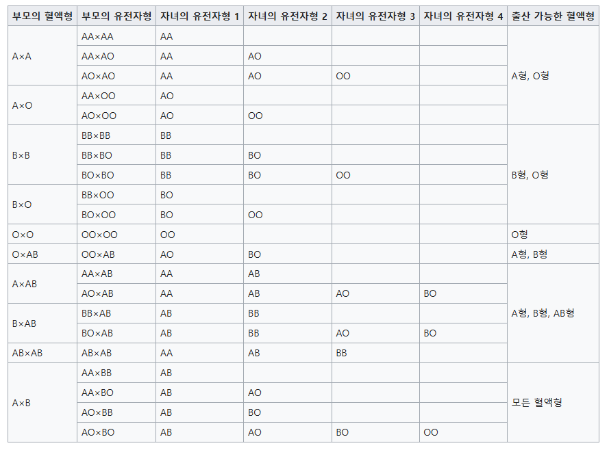 풀어서 이야기 하면 A형은 A형 항원을 가지고 있기에 A형 항원과 같은 항원을 가지는 사람이나 O형 항원을 가지지 않는 사람과 혼합이 되어도 자녀는 A형을 가질 수 있습니다. 반면 O형은 A형과 B형 항원을 모두 가지지 않으으로 O형과 같은 항원을 가지는 사람과 혼합되어 출산되는 자녀는 O형 혈액형을 가질 수는 없다고 하네요.