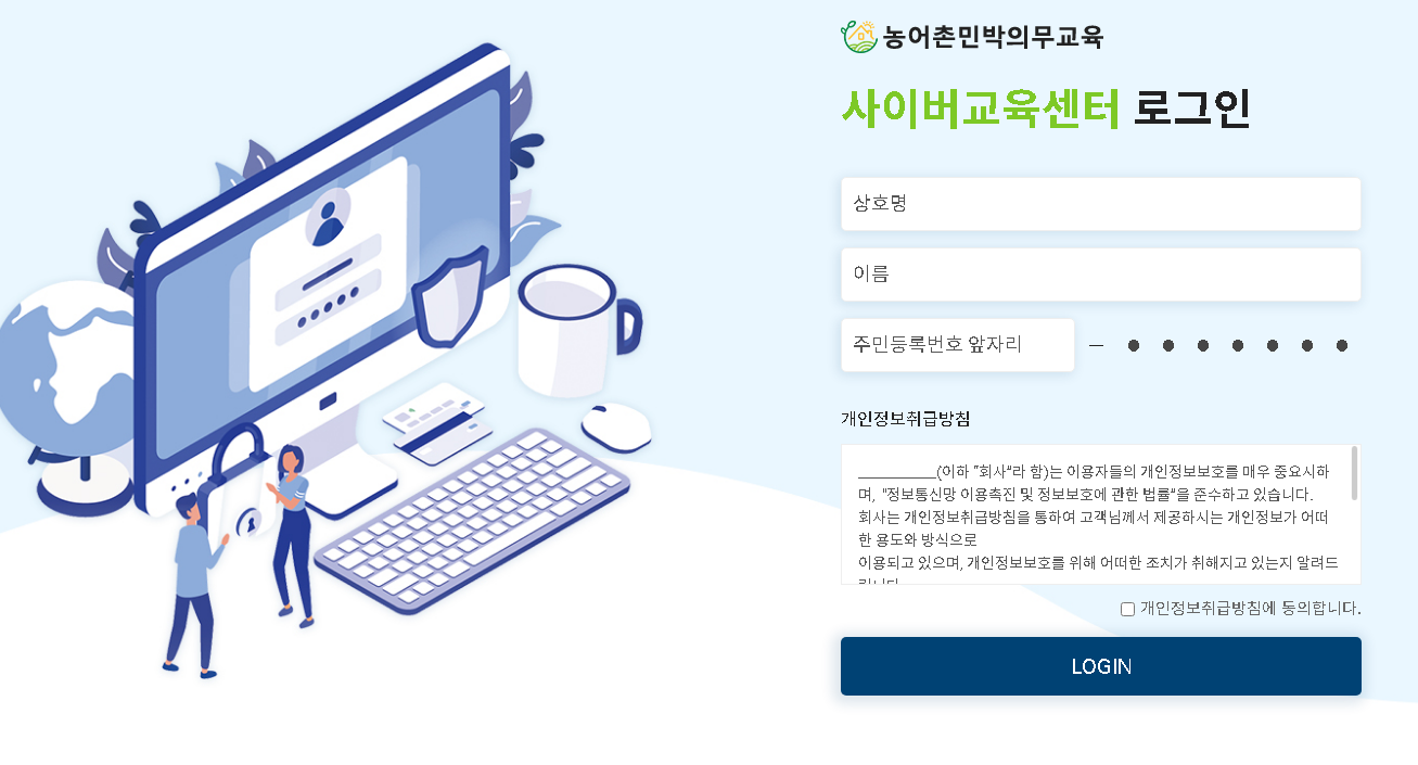 교육은 상호명과 이름, 주민번호 앞자리를 통하여 사이버교육센터에 로그인하시고 이용을 하실 수 있습니다. 의무교육으로 포함이 되어 있기 때문에 관련 지식 습득을 위하여 확인하시고 이수를 하셔야 한다고 합니다. 그럼 잘 확인하시길 바랍니다.