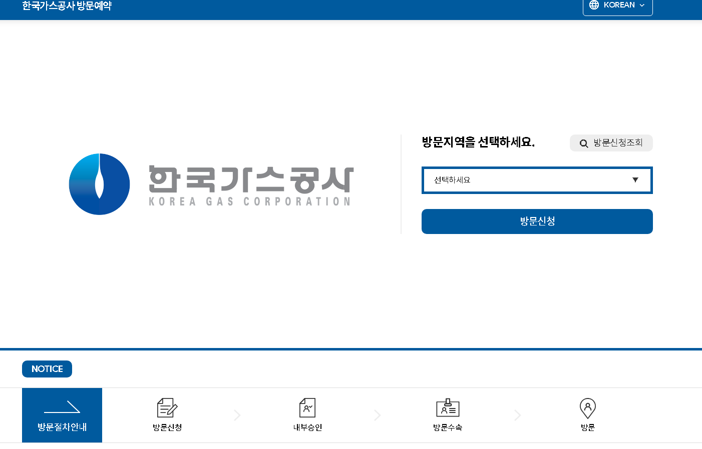 먼저 한국가스공사 홈페이지로 이동하여 절차를 확인하시고 방문신청을 진행하셔야 합니다. 절차의 진행은 방문신청 > 내부 승인 > 방문 수속 > 방문 단계를 거치게 됩니다. 관련된 공지사항을 확인하시고 신청 진행해보세요.