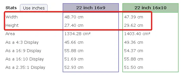 Visual TV Size Comparison : 22 inch 16x9 display vs 22 inch 16x10 display